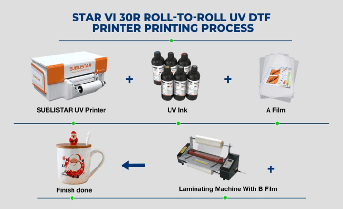 UV DTF printers use UV flatbed printers, UV roll-to-roll printers, or UV roll-to-plate all-in-one machines to print designs on A film and then cover B film. To transfer to the item, you need to tear off the A film first, and then print the pattern on the substrate, and press the pattern evenly back and forth by hand to make it completely transferred to the item. Finally, tear off the B film to complete the whole process.